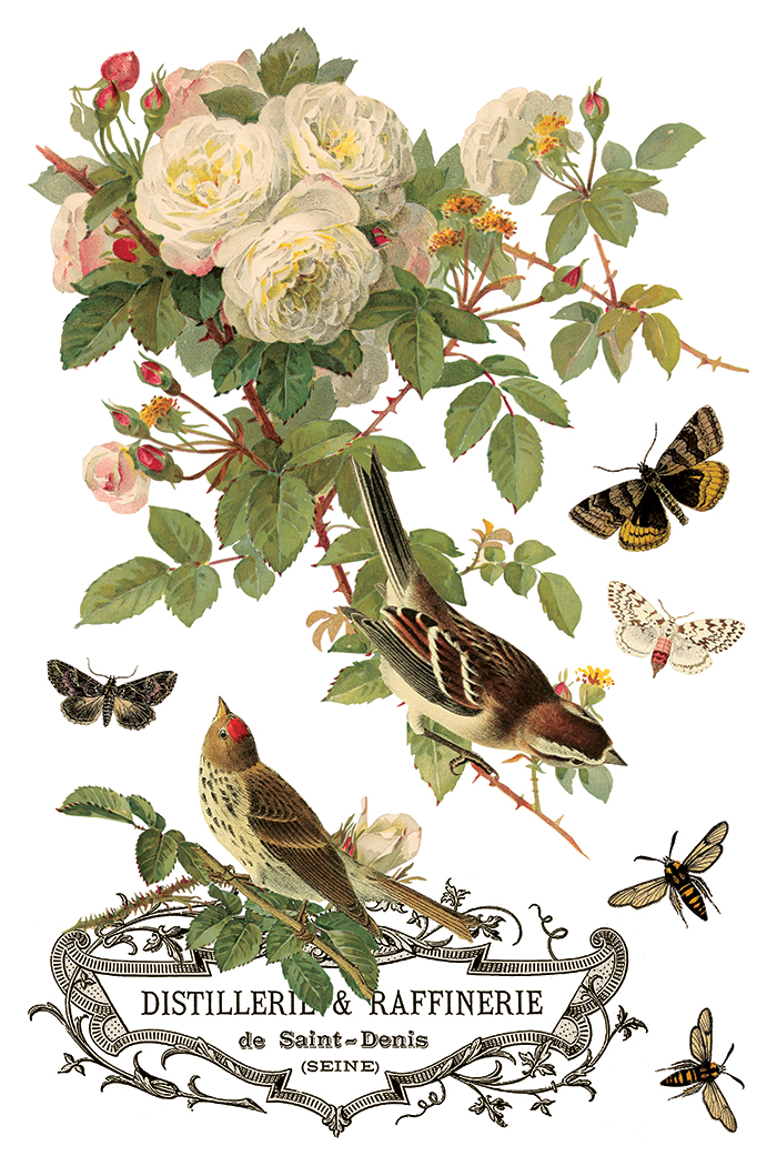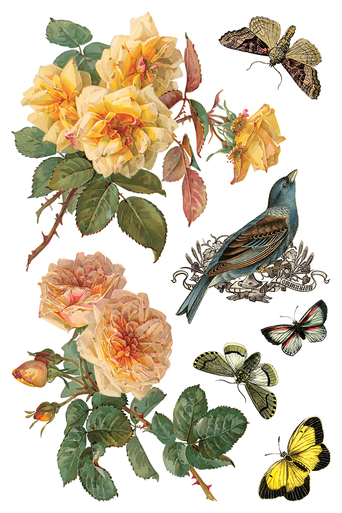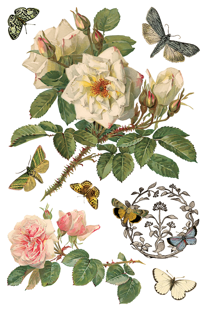 Using the illustrations of Paul De Longpré, the By Any Other Name – 8-Page 8×12″ Transfer Pad features a classic collection of roses paired with birds and butterflies. Sally sourced the antique prints directly from a dealer, selecting from a book of De Longpré’s rose studies. A contemporary of Katarina Klein, his work was often compared to hers for its expressive handling of botanicals, though each artist had a distinct approach. We curated a selection of prints that preserved the character and detail of his original compositions.