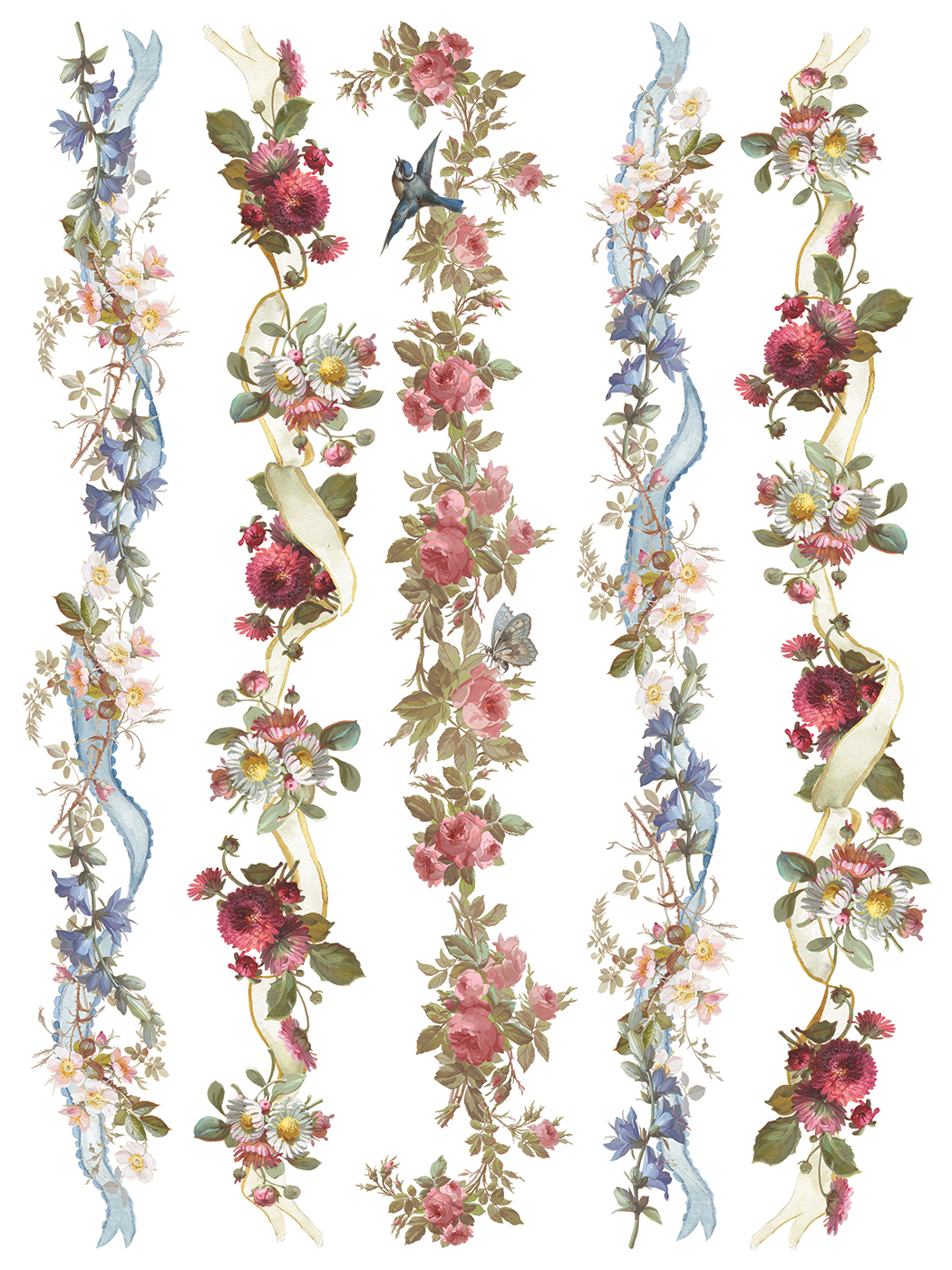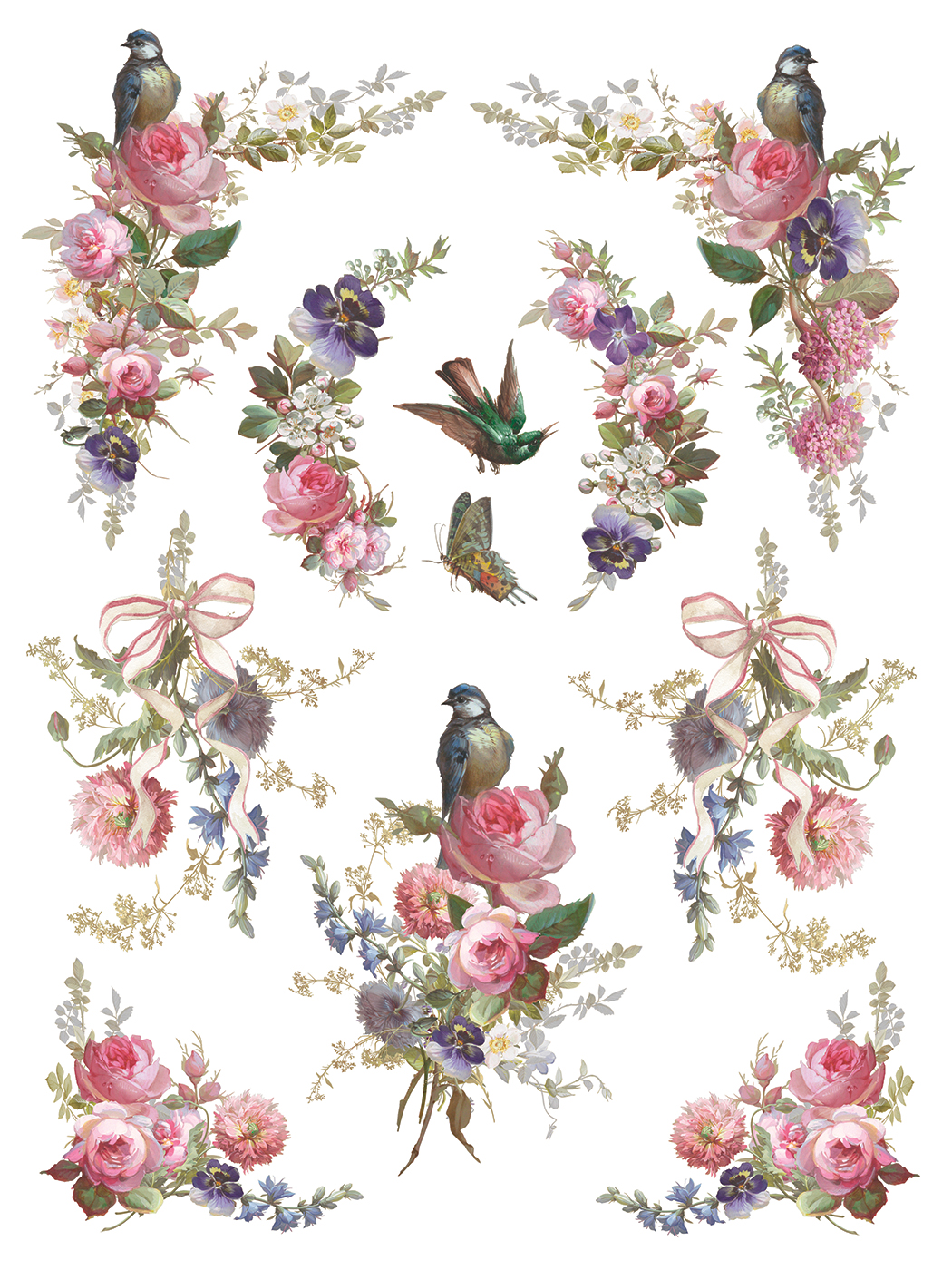 The Madeleine – 8-Page 12×16″ Transfer Pad is reminiscent of vintage Parisian décor, with artwork so decadent and luscious you can almost feel the richness of the original paint. The florals are vibrant, full, and deeply saturated, and the style closely echoes the St. Germaine collection—likely by the same unnamed artist whose work has long inspired us. The name Madeleine was chosen as a nod to a small French town near Saint-Germain, tying it back to the origins of the artwork. Several elements, including the flowing ribbons, were hand-painted by a contemporary artist, Annie Quigley, specifically for this collection to complement the vintage roses, birds, bows, and swags found in the original compilations.