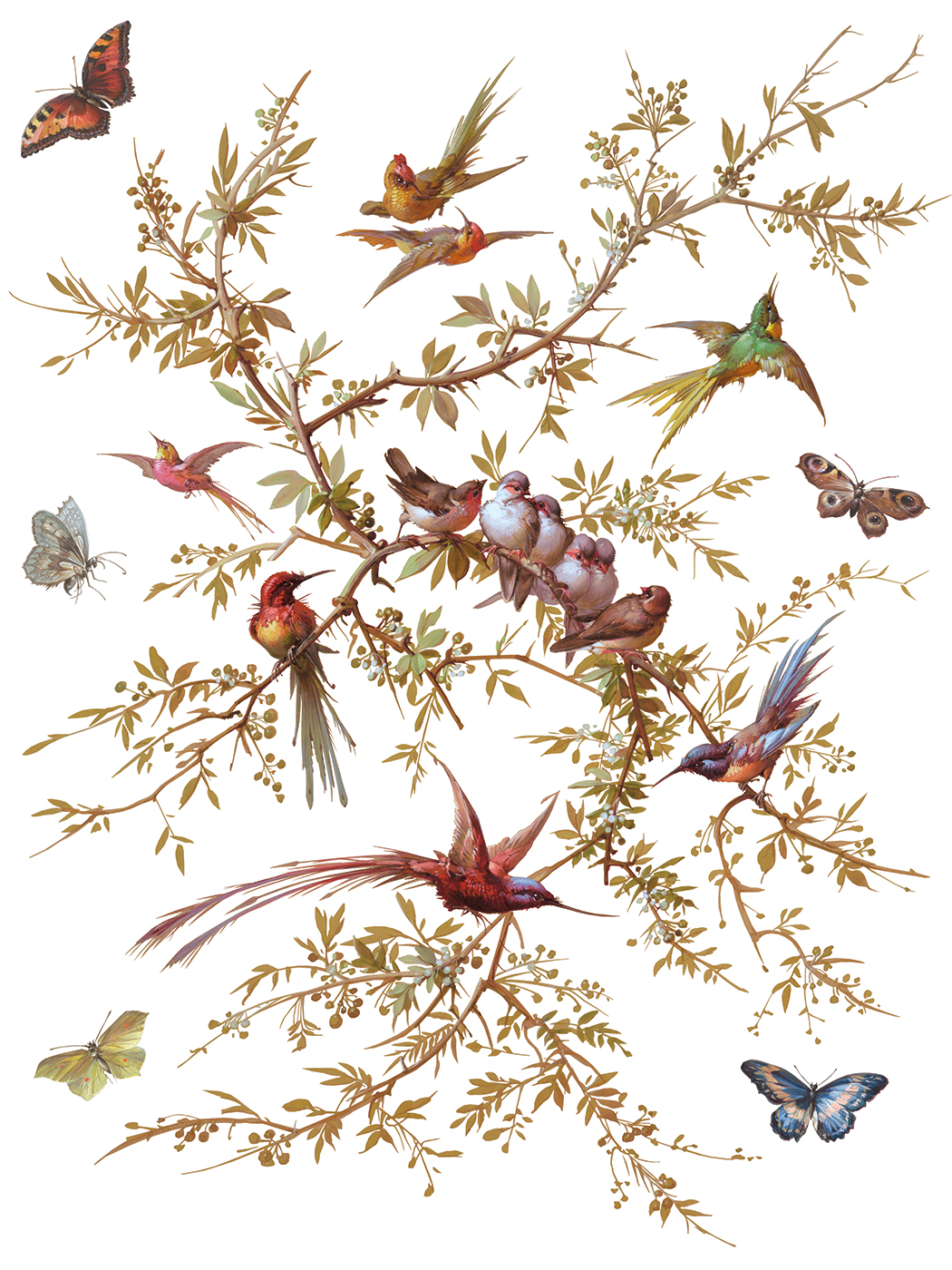 Designed with both small décor and furniture scale in mind, Madeleine includes corners, borders, drawer-backer motifs, and full bouquets that can stand alone as focal elements. Many of the arrangements come directly from the antique artwork exactly as they were found, offering lavish compositions that feel feminine, expressive, and beautifully over the top. Whether placed on a tray, a chest of drawers, or a curated vignette, Madeleine captures the indulgent beauty of historic French interiors in a way that invites bold, elegant creations.
