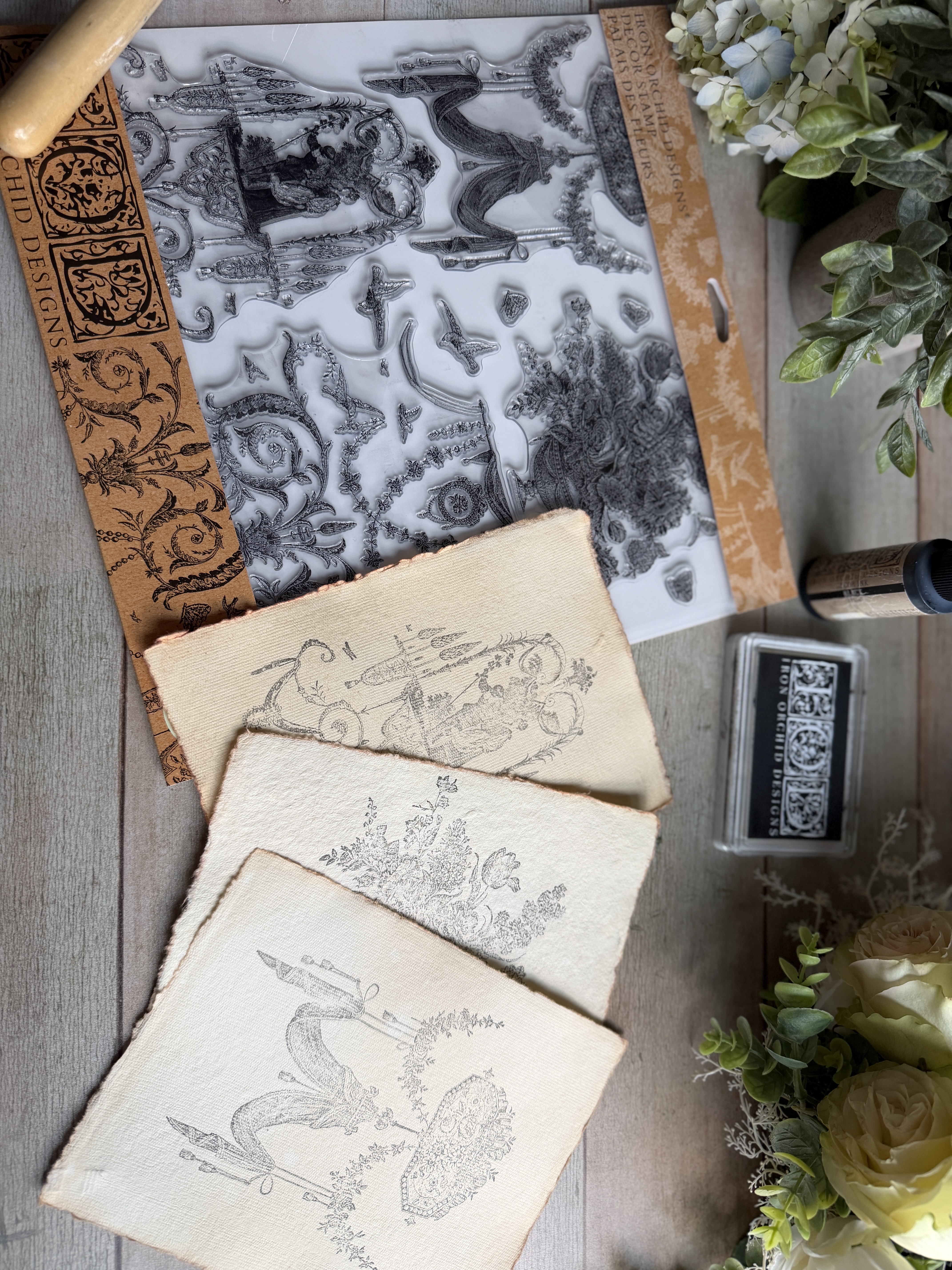 Inspired by 18th-century French toile de Jouy, the 12×12” Palais Des Fleurs Stamp was created from an authentic 1700s wallpaper discovered in the Cooper Hewitt Museum. We stayed as true to the original artwork as possible, adjusting only a few primitive figures that didn’t translate well to stamp form—to ensure every intricate detail would apply beautifully.