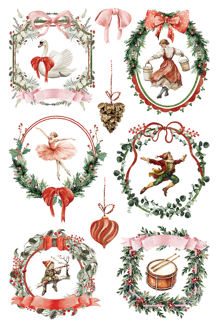 Use Partridge Lane to create darling wall art, upcycle ceramic ornaments for a vintage 12 Days of Christmas collection, or turn plain baubles into an entire set of ornaments with pretty wreaths and painterly details. Dress up cookie tins for hostess gifts or use the sweet details on wood blanks and wreaths.